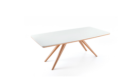 A mesa possui bi-tampo, resultando numa versatilidade ímpar na customização do tampo superior, podendo ser em diversos acabamentos. Isso a torna singular em sua categoria. Estruturada em madeira maciça e passeia entre os estilos vintage e moderno, com muita naturalidade.